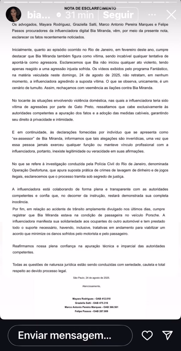 Ainda na postagem, os representantes de Bia Miranda falaram sobre as agressões que ela sofreu nas mãos do namorado: “No tocante às situações envolvendo violência doméstica, nas quais a influenciadora teria sido vítima de agressões por parte de Gato Preto, ressaltamos que cabe exclusivamente às autoridades competentes a apuração dos fatos e a adoção das medidas cabíveis, garantindo seu direito à privacidade e intimidade”, garantiram, antes de completar: