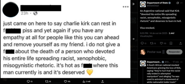 Byadminoutubro 16, 2025Departamento de Estado dos EUA mostra post de argentino celebrando a morte de Charlie Kirk e diz que ele teve seu visto revogado...