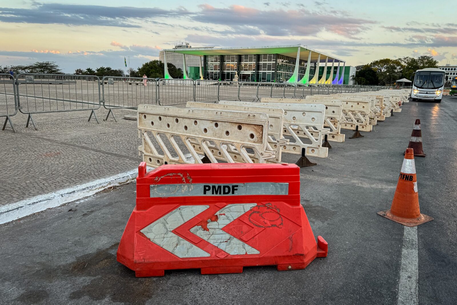 Grades e barreiras de trânsito ao longo da Praça dos Três Poderes, em Brasília, nos dias que antecedem o julgamento do golpe