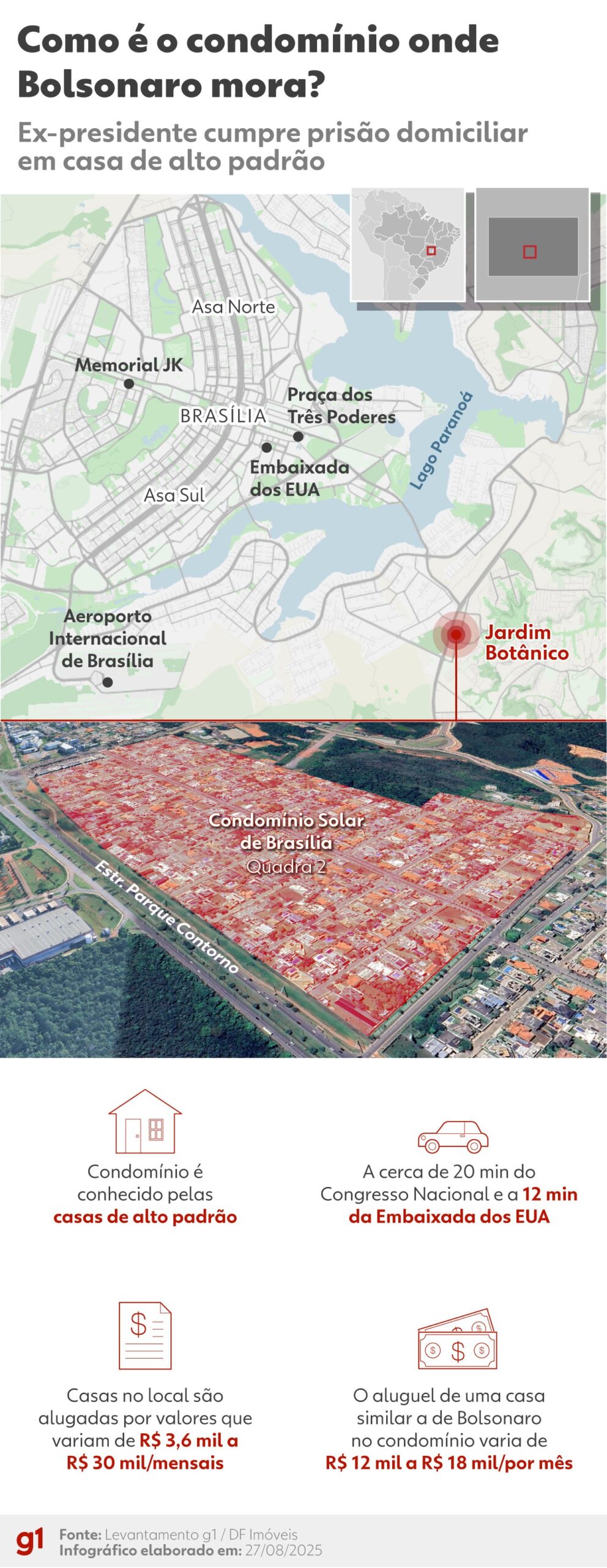 O ex-presidente cumpre prisão domiciliar em Brasília desde o último dia 4. A casa dele fica no Condomínio Solar, no Jardim Botânico – área nobre da capital.
