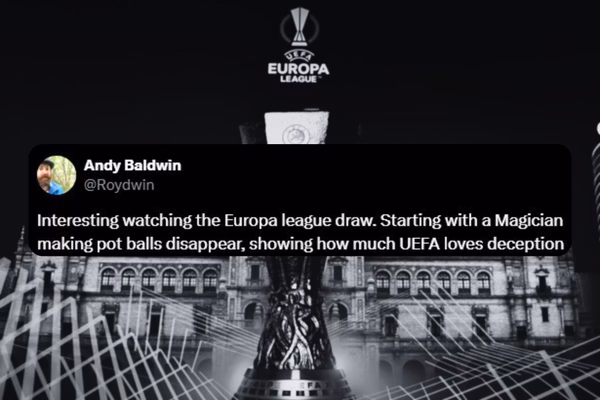 “Interessante assistir ao sorteio da Europa League. Começando com um Mágico fazendo as bolas desaparecerem, mostrando o quanto a UEFA adora enganar”.